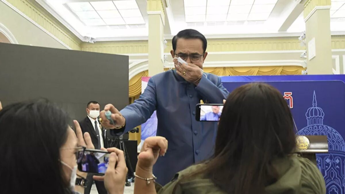 Tayland Başbakanı Prayut Çan-oça, haftalık düzenlenen basın toplantısı sonrası salondan ayrılmadan önce muhabirlere dezenfektan sıktı.
