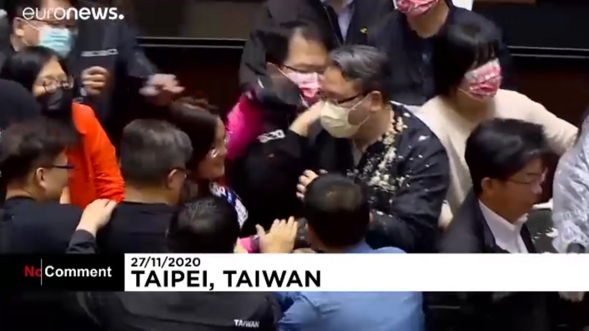 Yakında yürürlüğe girecek olan yasayı protesto eden muhalif bazı üyeler, iktidar partililere domuz bağırsağı fırlattı.
