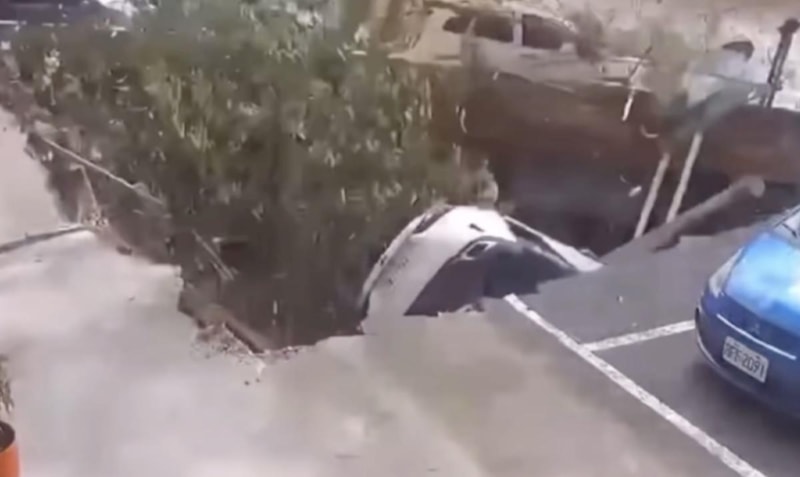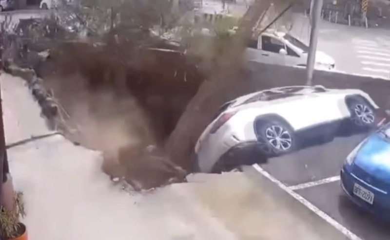 Xinzhu şehrinde park halindeki bir araç, aniden yaşanan göçük sebebiyle yerin 5 metre altına gömüldü.