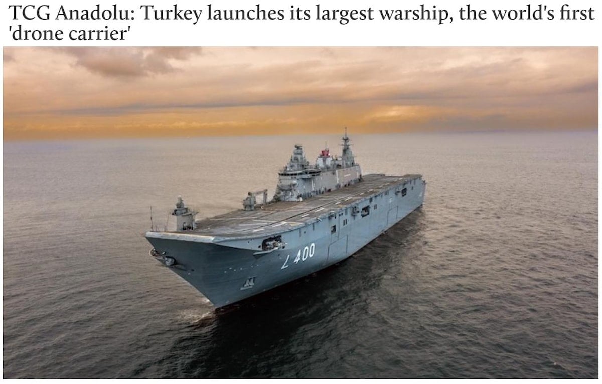 Türkiye'nin en büyük, dünyanın ilk insansız hava araçlarını taşıyan savaş gemisi. İstanbul'daki Sedef tersanelerinde inşa edilen TCG Anadolu adlı gemi, helikopter ve daha küçük pistlerden havalanan hafif uçaklar ile araç ve çıkarma gemilerini taşıyabiliyor.
