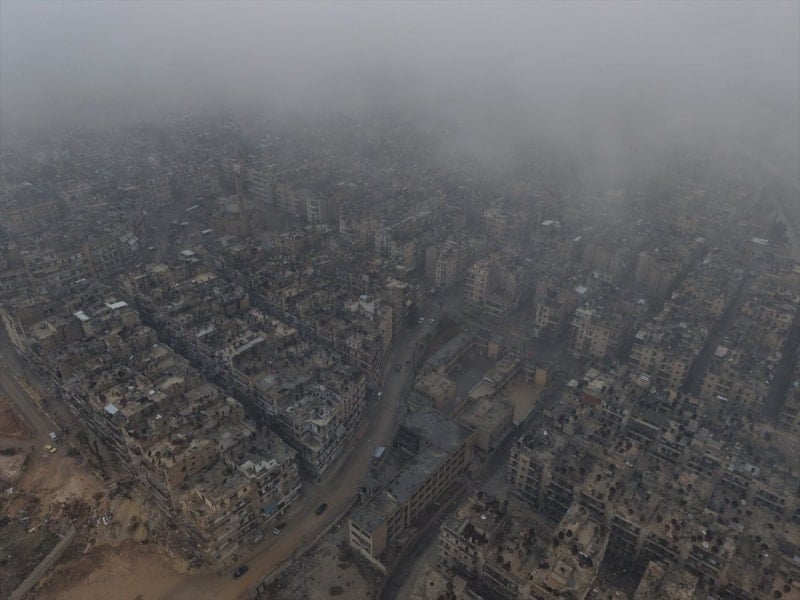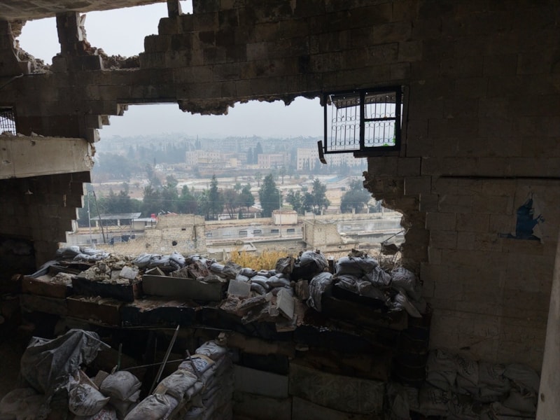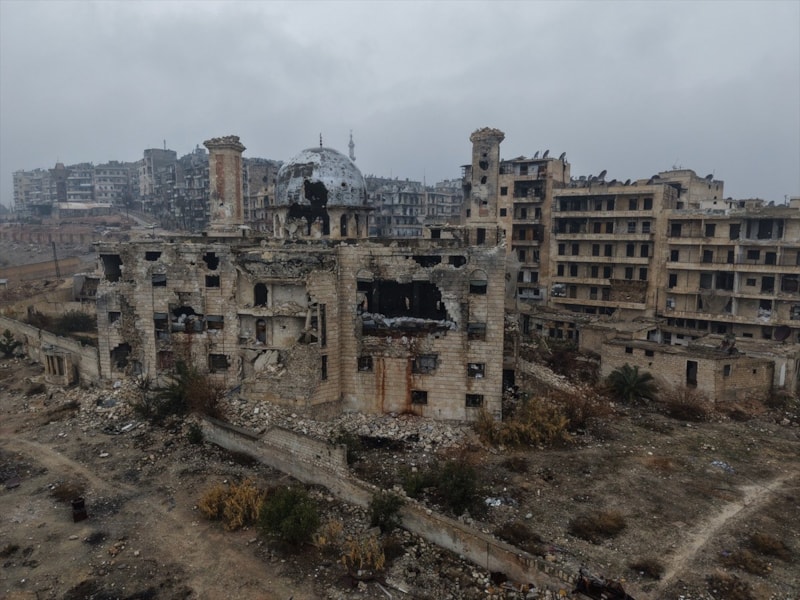 Suriye'nin Halep kentinde YPG'den arındılar son mahalle olan Şeyh Maksud'daki tahribat drone kamerasına yansırken, caminin teröristler tarafından mevzi haline dönüştürülmesi de dikkat çekti.