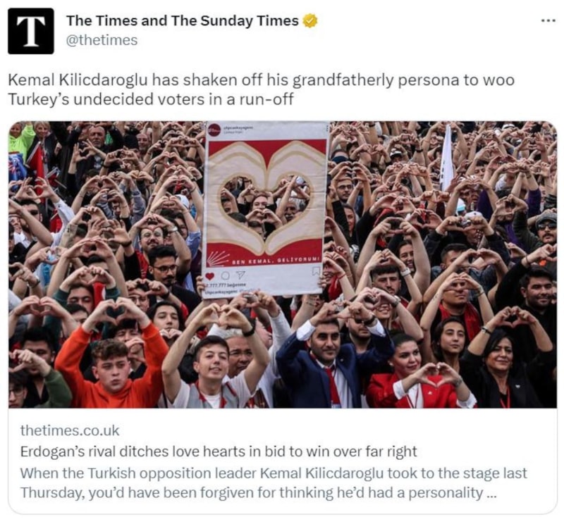 74 yaşındaki Kılıçdaroğlu'nun, ikinci turda Türkiye'nin kararsız seçmenini etkilemek için "iyi kalpli ve dede kimliğinden sıyrıldığı" belirtildi. Bu tespitten şöyle bahsedildi: