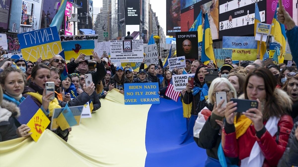 Dünyanın dört bir yanında Rusya'nın tavrı protesto edilirken, bir gösteri de ABD'nin New York kentindeki Times Meydanı'nda düzenlendi.