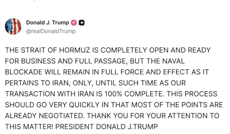 İran az önce, İran Boğazı’nın tamamen açık olduğunu ve tam geçişe hazır olduğunu açıkladı. Teşekkürler! Hürmüz Boğazı tamamen açık ve ticarete hazır, tam geçişe uygun durumda, ancak donanma ablukası yalnızca İran'ı ilgilendiren konularda tam güç ve etkiyle devam edecek, ta ki İran ile işlemimiz yüzde 100 tamamlanana kadar!