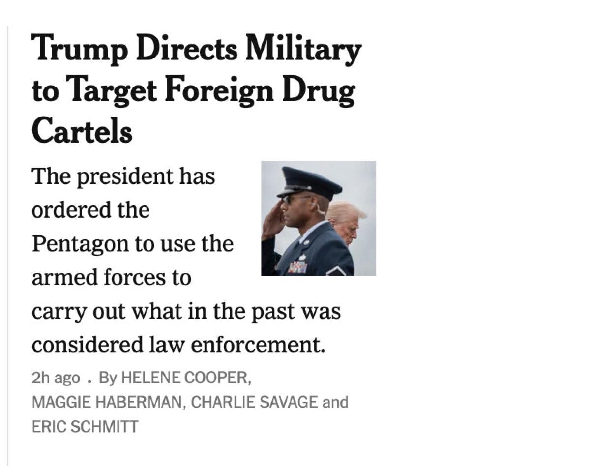 New York Times'ın konuya yakın kaynaklara dayandırdığı habere göre, ABD Başkanı Donald Trump, Pentagon'a Latin Amerika'daki bazı uyuşturucu kartellerine karşı askeri operasyon başlatması talimatını veren gizli bir direktifi imzaladı.