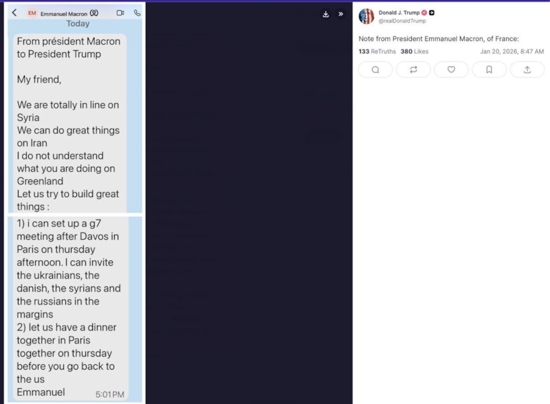 Fransa Cumhurbaşkanı'nın mesajında, "Dostum, Suriye konusunda tamamen aynı çizgideyiz. İran konusunda da birlikte çok büyük işler yapabiliriz. Grönland konusunda ne yaptığını anlamıyorum.