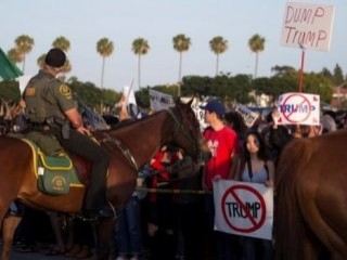 Costa Mesa'daki miting binasının önünde toplanan gruplar, trafiği tıkadı ve çıkan arbede esnasında bir polis arabasının camları kırıldı. Gösteriye müdahale eden polis, 20 kişiyi gözaltına aldı. Trump'ın konuştuğu Pacific amfi tiyatrosu 18 bin kişi kapasitesini doldururken mitinge katılmak isteyen yüzlerce kişi kapıdan çevrildi.