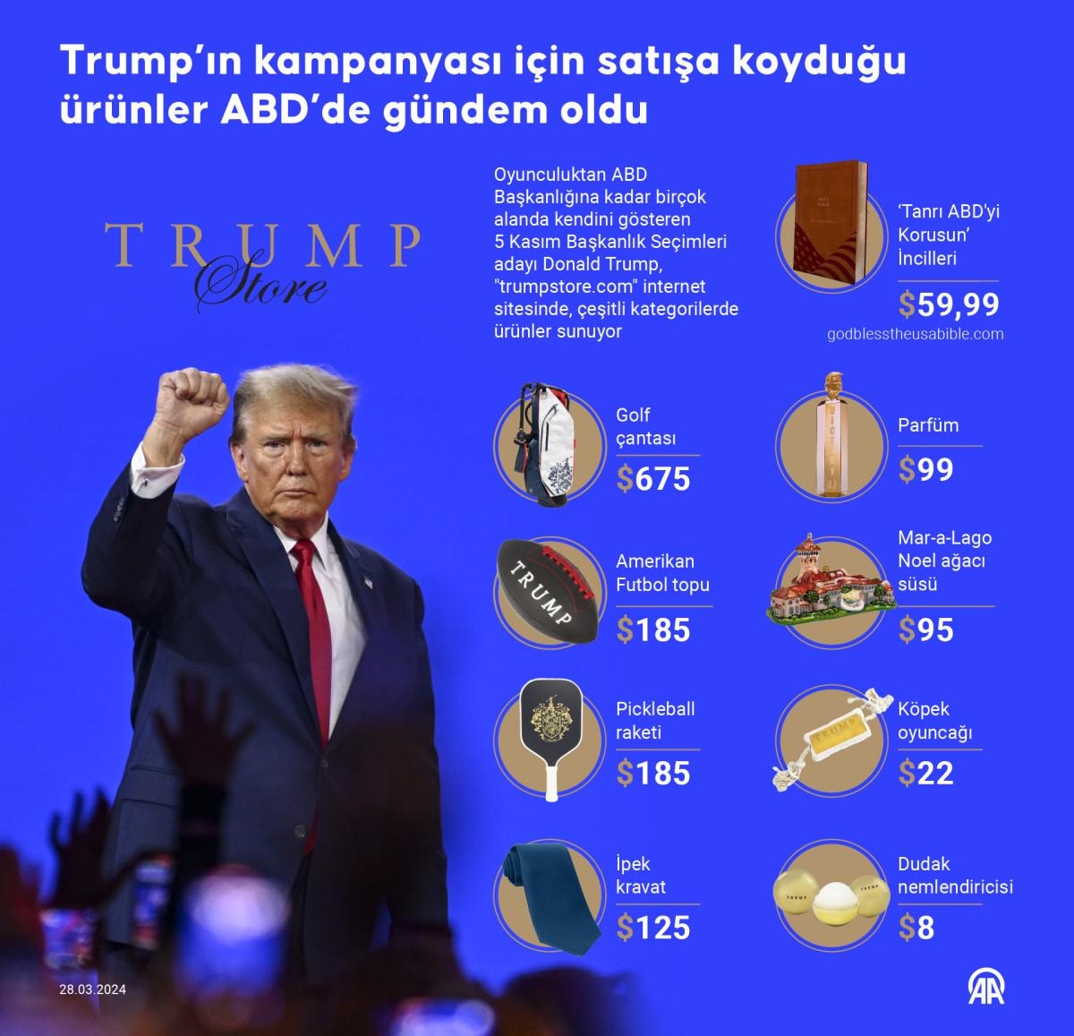 Bu ürünlerin en popülerlerinden bazıları ise 50 dolarlık MAGA (Make America Great Again) şapkası, Trump'ın isminin yer aldığı 185 dolarlık Amerikan futbolu topu ve 125 dolarlık ipek kravat oldu.