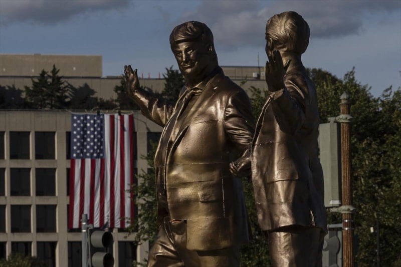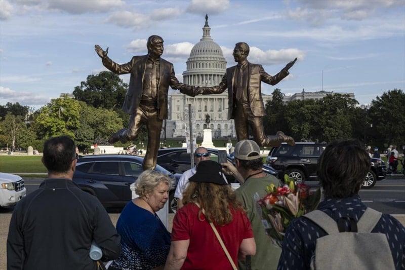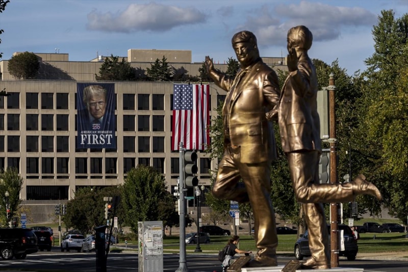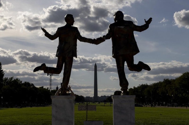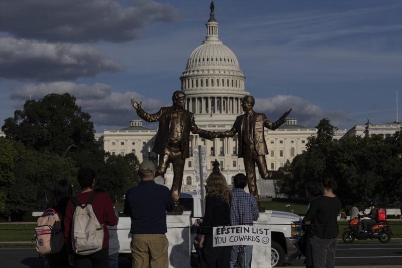 ABD’de Trump ile Jeffrey Epstein’ı el ele tasvir eden heykel, geçen hafta kaldırılmasının ardından tekrar Kongre binası önüne yerleştirildi.