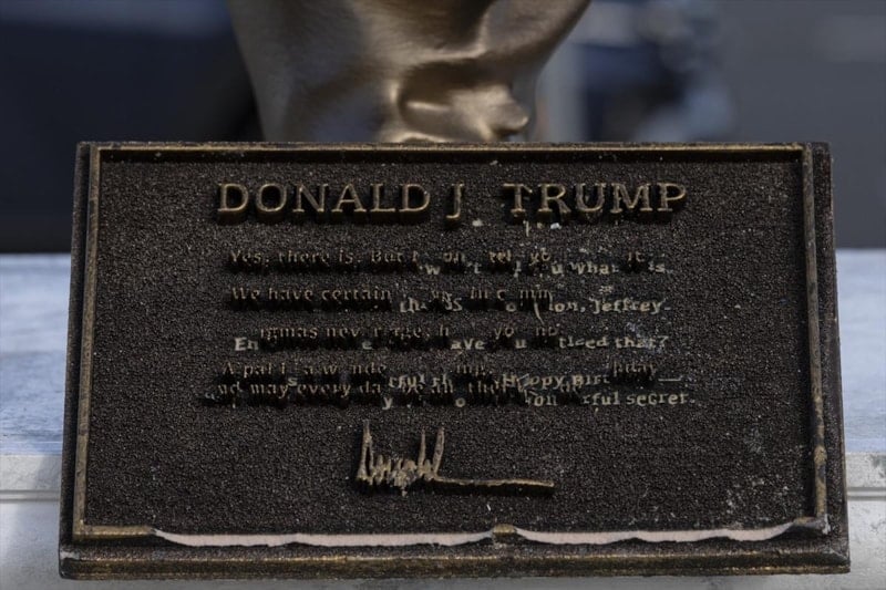 Heykel, “izin kurallarına uymadığı” gerekçesiyle 24 Eylül’de kaldırılmıştı. Taşıma sırasında bazı kısımları hasar gören heykel, onarıldıktan sonra yeniden Kongre binası önüne konuldu. Heykelin altındaki plaka “Sonsuza dek en iyi arkadaşlar” ifadesini içeriyor. Kaidesinde ise Trump ile Epstein arasındaki uzun süreli bağa atıfta bulunan metin yer alıyor.