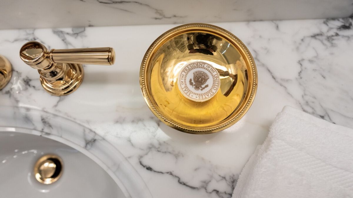 Trump, banyoyu siyah-beyaz cilalı Statuary mermeriyle kaplattığını söyledi. Banyonun bazı kısımlarının altın kaplama olması dikkat çekti. Trump, mermerin Lincoln döneminde de kullanılmış olabileceğini savundu.