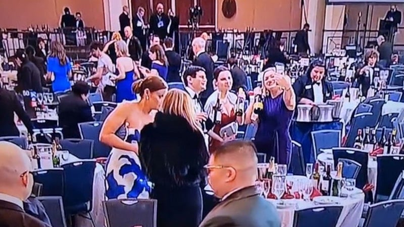 Olayın ardından sosyal medyada hızla yayılan videolar arasında bir görüntü özellikle dikkat çekti. Söz konusu videoda, bazı basın mensuplarının saldırının hemen ardından güldüğü, selfie çektiği ve salondan ayrılırken şarap şişeleri taşıdığı iddia edildi.