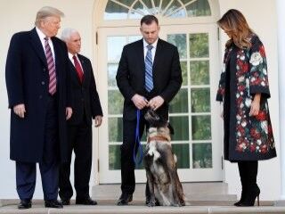 ABD Başkanı Donald Trump; eşi Melania Trump, Başkan Yardımcısı Mike Pence ve Bağdadi operasyonunda kullanılan Conan ile Beyaz Saray'ın bahçesinde kameraların karşısına çıktı.