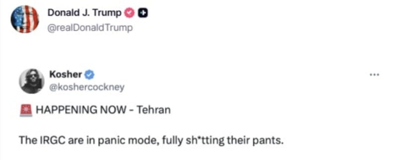 Trump'ın paylaşımında "Devrim Muhafızları Ordusu panikte. Tam olarak altlarına yapıyorlar" ifadeleri yer aldı.