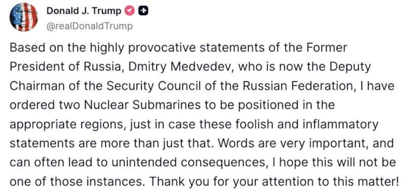 ABD Başkanı Donald Trump, eski Rusya Devlet Başkanı Dmitry Medvedev'in açıklamalarına tepki olarak, "iki nükleer denizaltının uygun bölgelere yeniden konuşlandırılması" emrini verdiğini şu sözlerle ilan etti: