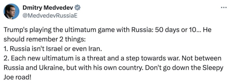 Dmitry Medvedev Pazartesi günü X’te yaptığı bir paylaşımda ABD Başkanı Donald Trump’ın Rusya ile "ültimatom oyunu" oynadığını ve böyle bir yaklaşımın ABD’nin de dahil olduğu bir savaşa yol açabileceğini şu sözlerle aktardı: