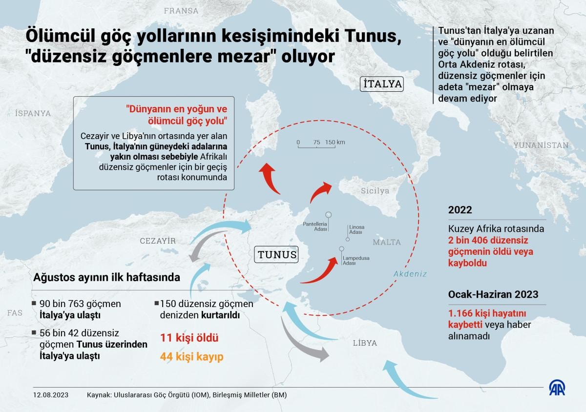 Tunus'ta sınır ve sahil güvenliğini sağlayan Ulusal Muhafızlar İdaresi, 3 Ağustos'ta 150 düzensiz göçmenin kurtarıldığını açıklarken, 7 Ağustos'ta 11 kişinin öldüğü ve 44 kişinin kayıp olduğu bildirildi.