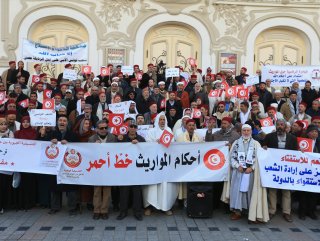 Aşırılığı Terk ve İtidal İçin İmamlar Derneği, başkent Tunus'taki Belediye Tiyatrosu önünde, "mirasta eşitliği öngören" yasa tasarısı karşıtı gösteri düzenledi.