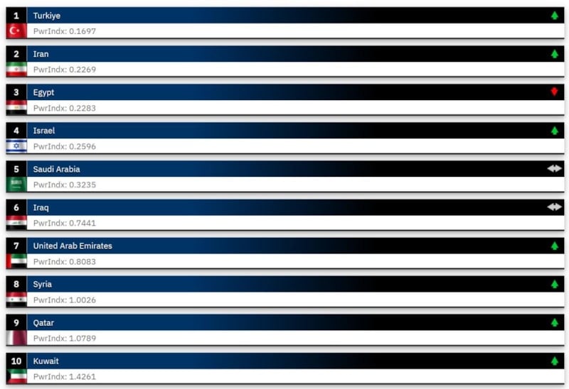 İkinci sırada İran yer alırken, bu ülkeyi sırasıyla Mısır, İsrail ve Suudi Arabistan takip ediyor.