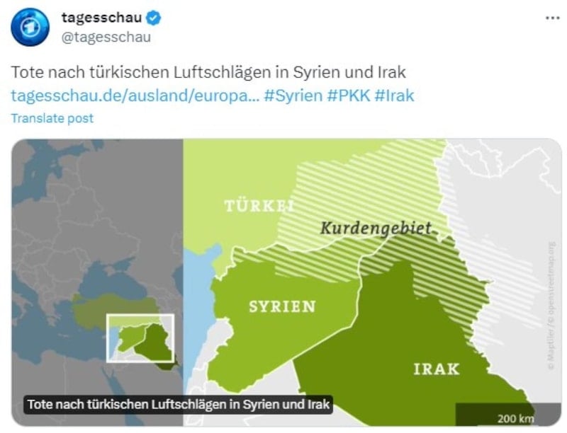 Alman yayın organı, harita üzerinde sözde 'Kürdistan' bölgesinden söz etti. Bununla yetinilmeyerek, teröristlerden 'savaşçılar' şeklinde bahsedildi.