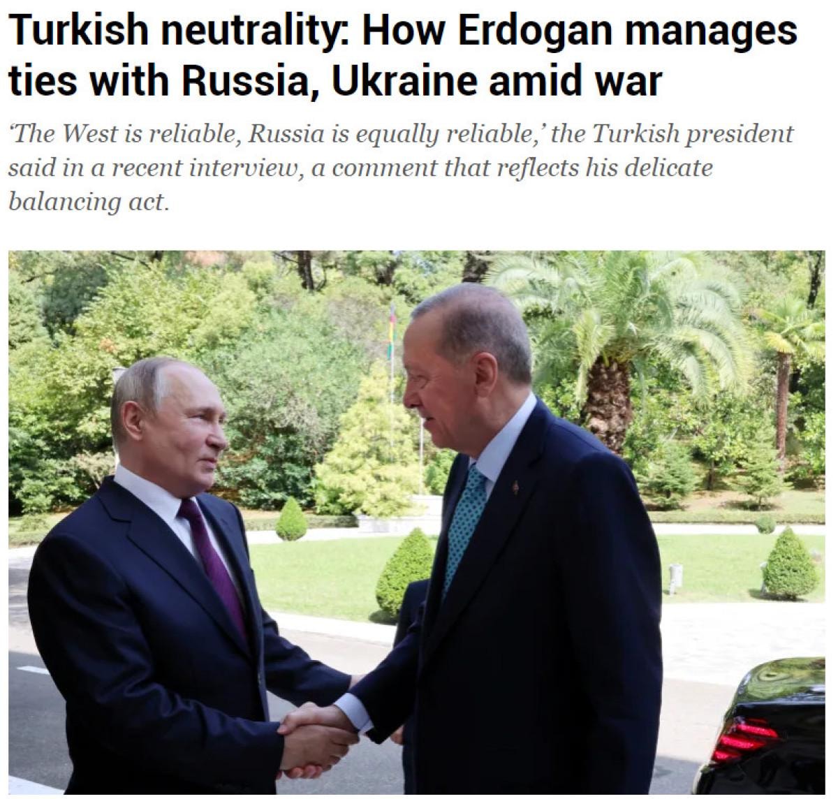 Cumhurbaşkanı Recep Tayyip Erdoğan'ın, savaşan taraflar, Batı ve Çin arasında dikkatli bir denge kurduğu belirtildi.