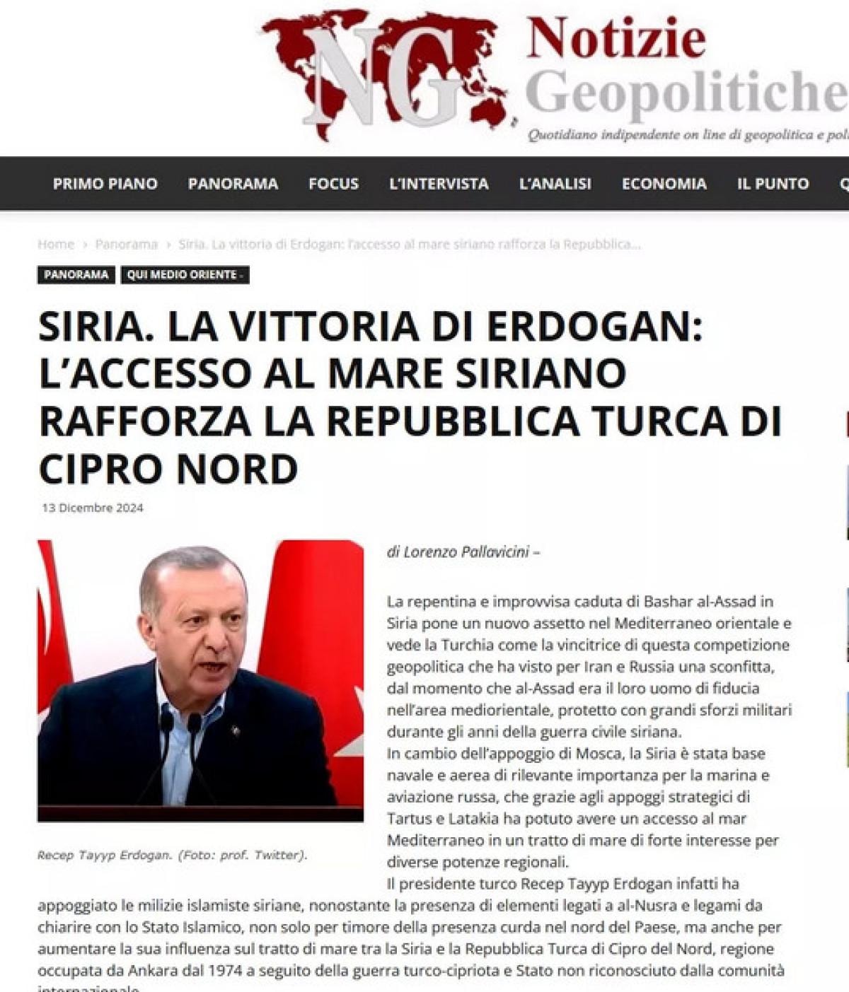 Notizie Geopolitiche’teki “Erdoğan’ın Zaferi: Suriye Denizine Erişim Kuzey Kıbrıs Türk Cumhuriyeti’ni Güçlendiriyor” başlıklı analizde şu ifadeler yer aldı: