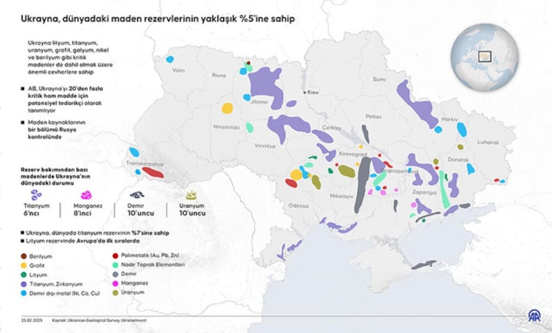 Ukrayna, yaygın olarak kullanılan kritik madenlerin büyük çoğunluğuna sahip olsa da kömür yatakları başta olmak üzere bunların bir kısmı 2014’te Rusya'nın Kırım'ı yasa dışı ilhakı ve 2022’de başlayan savaş sonrasında ya Moskova'nın kontrolüne geçti ya da cepheye yakın konumlarda yer alıyor.