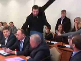Ukrayna Meclisi'nde yolsuzlukla mücadeleyle ilgili görüşmeler sırasında milletvekili Vladimir Parasyuk bir anda yerinden kalkıp Ukrayna Güvenlik Servisi başkan yardımcısı ve aynı zamanda milletvekili olan Vasyl Hrytsak'ın tekmeyle yüzüne vurdu.