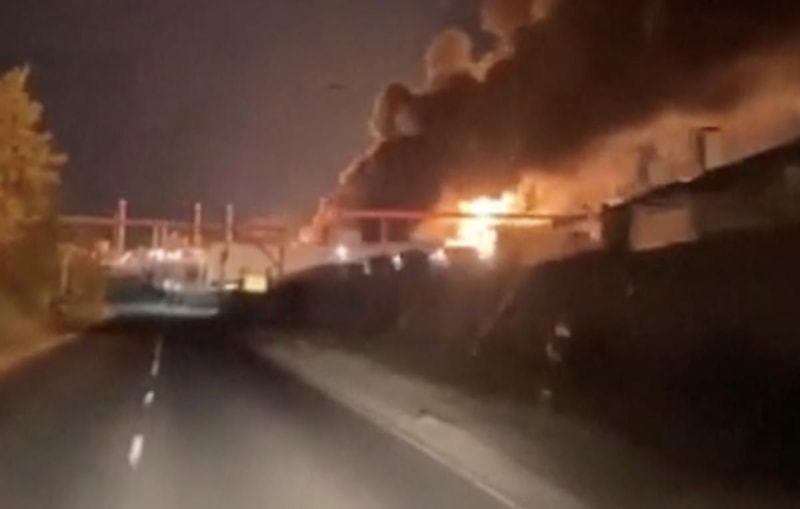 Vurulan tesisten yükselen alevler ve yoğun duman, sosyal medyada paylaşılan görüntülere yansıdı.