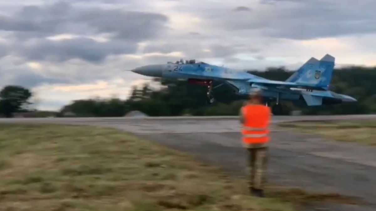 Ukrayna Hava Kuvvetleri’nin envanterinde bulunan Rusya yapımı Su-27 savaş uçağı otoyola inişi sırasında bir yön tabelasını yerinden kopardı.
