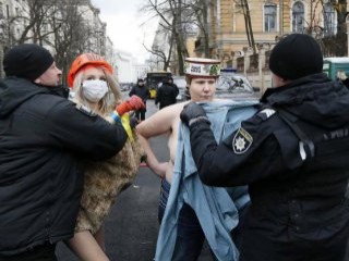 Ukrayna'nın ulusal bayramı Haysiyet ve Özgürlük Günü'nde Kiev'de başkanlık sarayı yakınında gerçekleşen çıplak protestoya katılan Femen üyesi kadınlar gözaltına alındı.