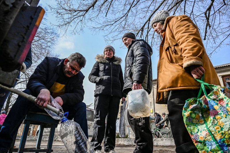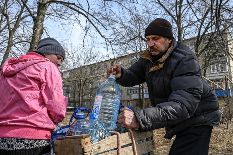 Su ihtiyacını karşılamaya çalışan Ukraynalılar, bombardıman tehlikesi altında sıra beklerken objektiflere yansıdı.