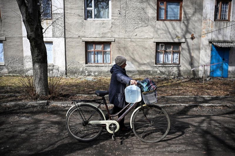 Güçlü patlama seslerinin duyulduğu, savaşın taze izlerini taşıyan Çasov Yar'ın merkezinde her gün su getirilen deponun önünde kuyruğa girenler görüntülendi.
