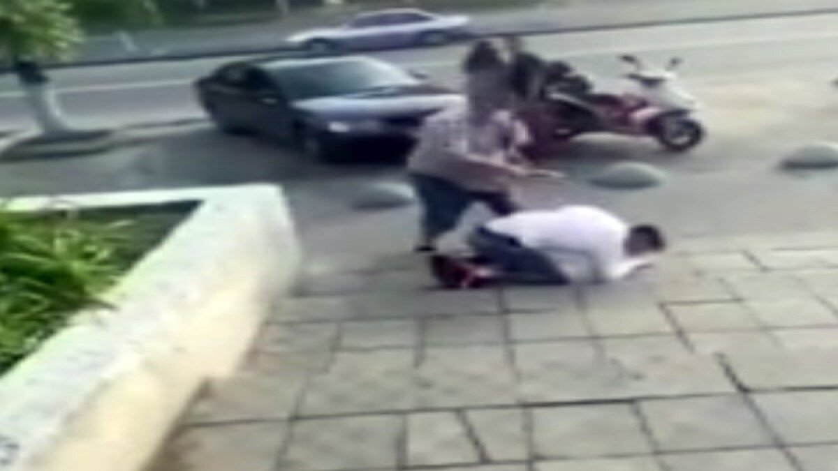 Bu sırada diğer şahıs, arkası dönük kişinin sırtına tekme atmaya çalışırken yere kapaklanıyor. Bunun üzerine diğer kişinin güldüğü ve yerdeki adama salamla birkaç kez daha vurduğu görülüyor.
