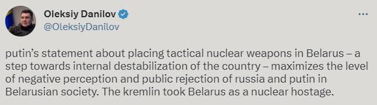Kiev yönetiminden bu adıma tepki gecikmedi. Ukrayna Ulusal Güvenlik ve Savunma Konseyi Sekreteri Oleksiy Danilov, "Kremlin, Belarus'u 'nükleer rehin' aldı." ifadesini kullandı.