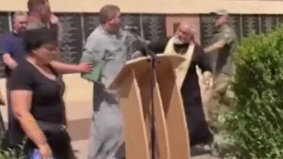 Moskova Patrikhanesi’ne bağlılığını ilan eden Rus yanlısı başka bir rahip, askerin tabutunun başından ayrılarak kürsüye yürüdü. Boynunda bulunan hacı eline alarak kürsüdeki Vasilyuk’a saldıran Rus yanlısı rahip, törendeki askerler tarafından engellendi. Vasilyuk ise kendisine saldıran Rus yanlısı rahibi iterek karşılık verdi.
