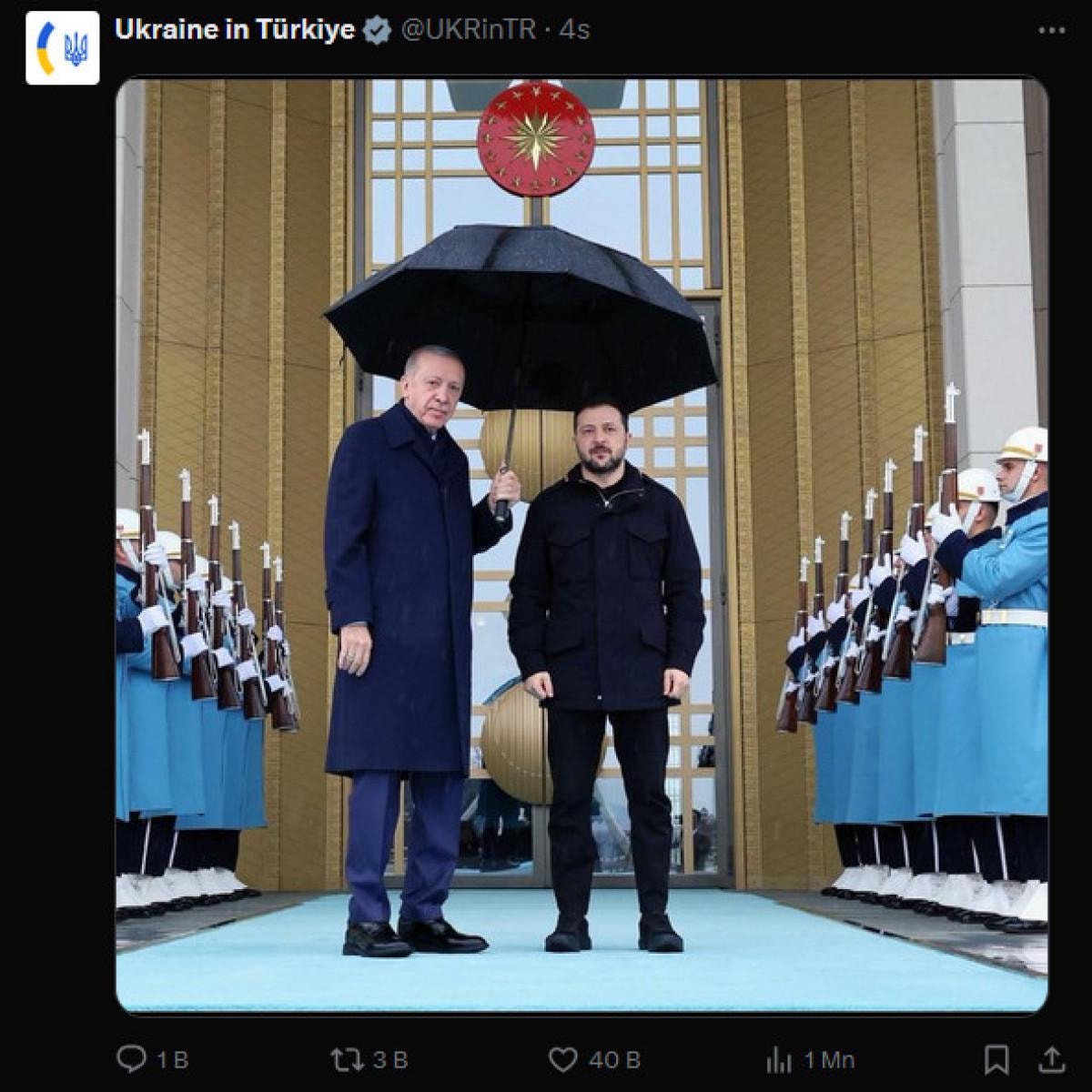 Ukrayna'nın Ankara Büyükelçiliği X sosyal medya hesabından yapılan paylaşımda, Cumhurbaşkanı Recep Tayyip Erdoğan'ın 18 Şubat'ta Beştepe'de Zelensky'yi karşıladığı anlardan bir kare yer aldı.