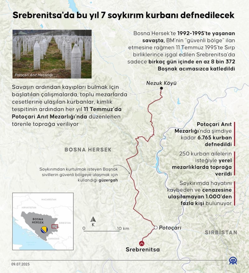 Srebrenitsa'nın 11 Temmuz 1995'te Ratko Mladic komutasındaki Sırp birliklerince işgal edilmesinin ardından BM askerlerine sığınan Boşnaklar, Sırplara teslim edildi. Sırplar, en az 8 bin 372 Boşnak erkeği ormanlık alanlar, fabrikalar ve depolarda katletti. Toplu mezarlara gömülen Boşnaklar, Potoçari Anıt Mezarlığı'na defnediliyor.