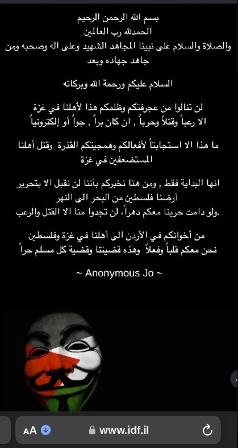Ürdünlü hackerlar, ele geçirdikleri İsrail ordusunun internet sitesinde yayımladığı mesajda, "Gazze'deki halkımıza karşı kibriniz ve zulmünüz, havada, karada ve elektronik ortamda size korku, ölüm ve savaştan başka bir şey getirmeyecektir." ifadesi kullanıldı.