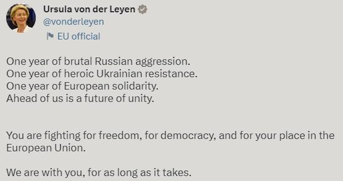 Bir yıllık acımasız Rus saldırganlığı. Bir yıllık kahramanca Ukrayna direnişi. Avrupa dayanışmasının bir yılı. Önümüzde beraberliğin geleceği var. Özgürlük, demokrasi ve Avrupa Birliği'ndeki yeriniz için savaşıyorsunuz. Ne kadar sürerse sürsün yanınızdayız.