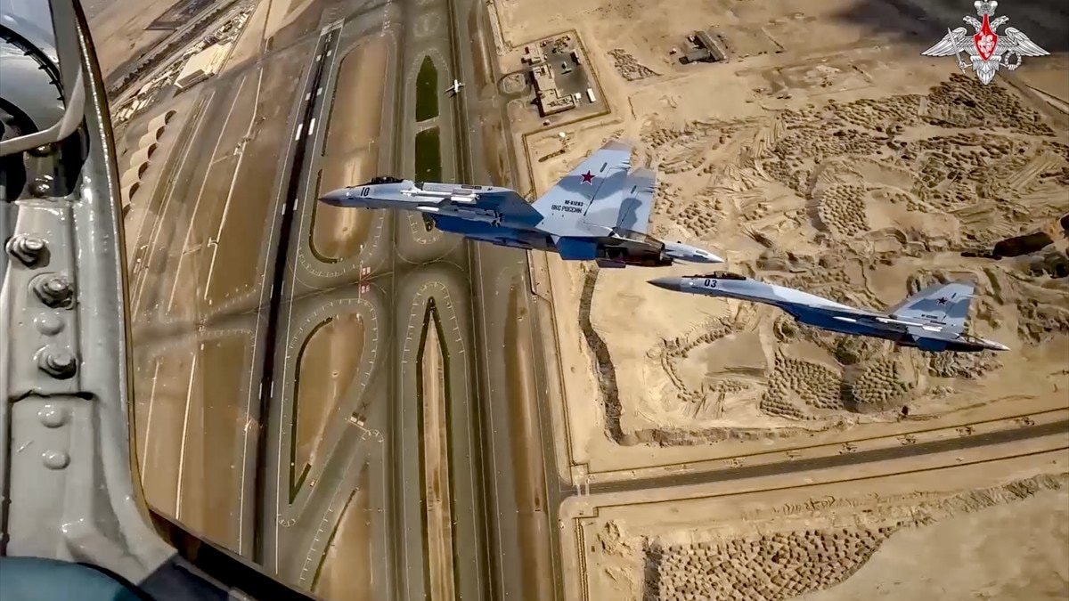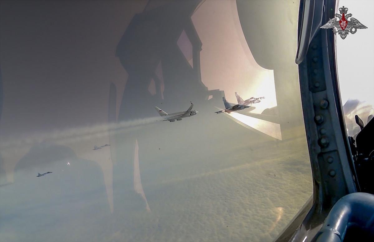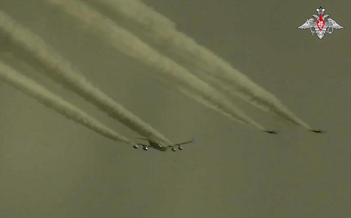 Rusya Savunma Bakanlığının yayınladığı videoya göre, Putin'in içerisinde bulunduğu İL-96 model devlet başkanlığı uçağına eşlik etmek üzere savaş uçakları da kalkış yaptı.