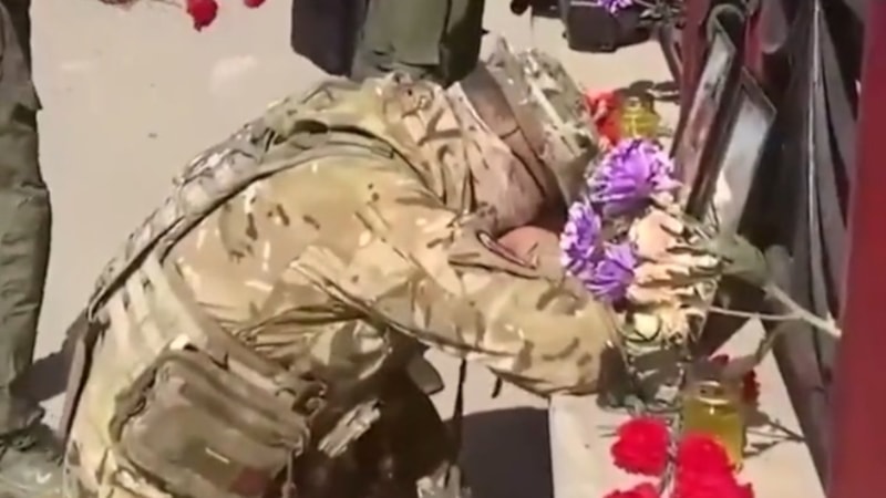 O savaşçılardan biri, Novosibirsk'teki anma noktasına konulan fotoğrafların önünde diz çökerek ağladı.