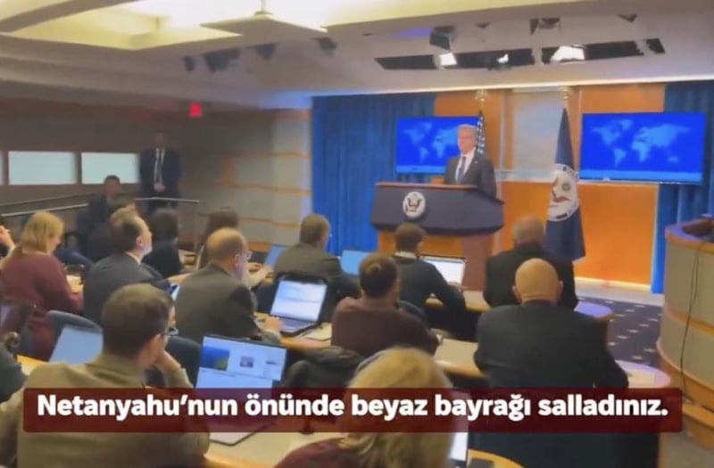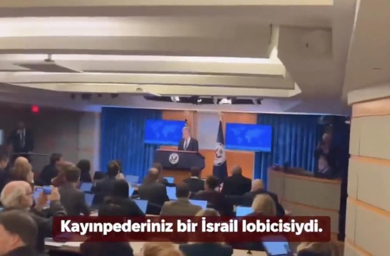 ABD Dışişleri Bakanı Blinken, görevindeki son konuşmasını yaparken Yahudi gazeteci Max Blumenthal, Blinken'ın konuşmasını yarıda kesti.