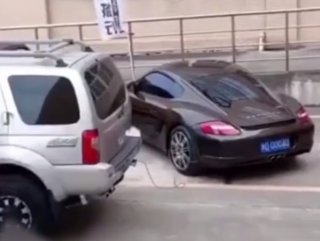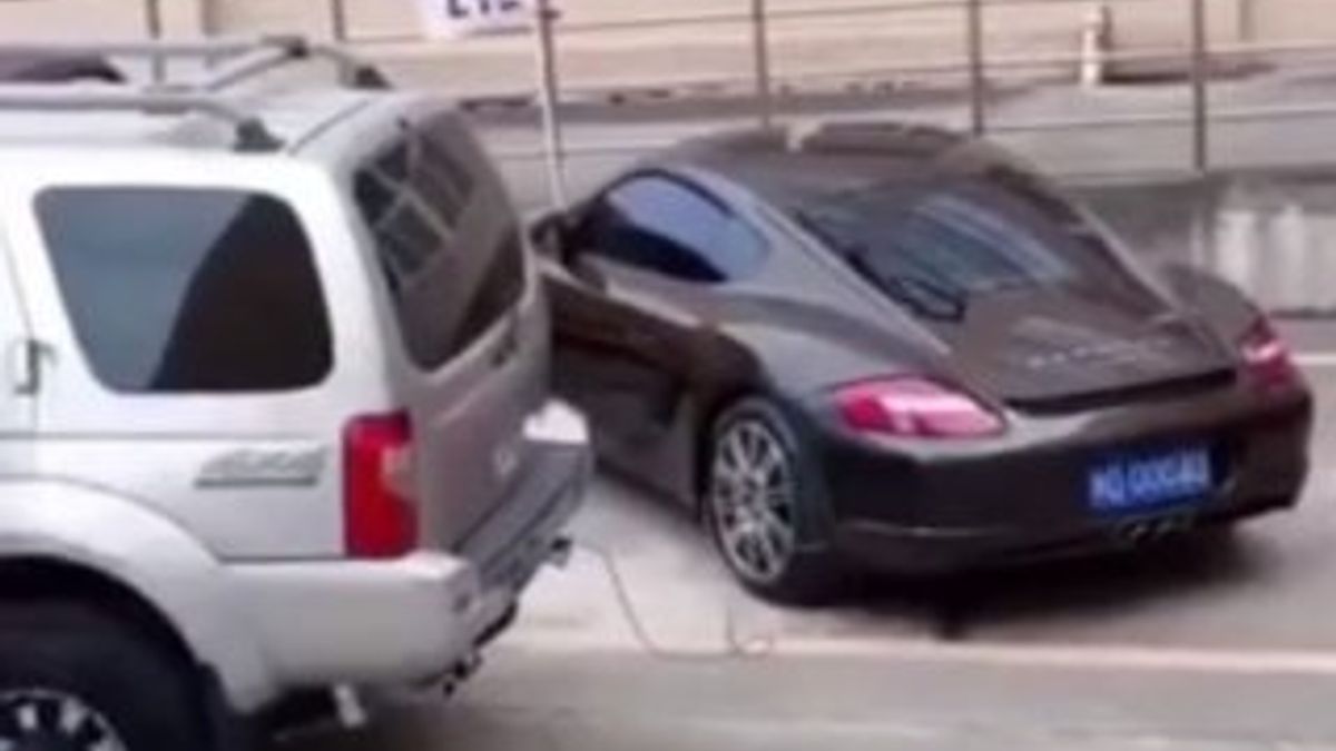 Aracını park etmek isteyen sürücü, yanlış park nedeniyle bir süre bekledi. Gelen kimsenin olmadığını fark eden sürücü, kendi aracına bir aparat takarak, yanlış park eden aracı yerinden oynattı.
