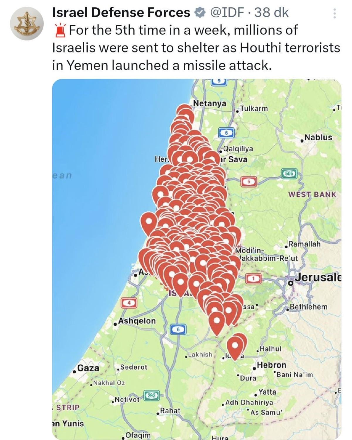 İsrail Savunma Kuvvetleri’nden (IDF) yapılan açıklamada, Husiler tarafından fırlatılan bir füze nedeniyle ülkede sirenlerin çaldığı ve milyonlarca İsraillinin tedbir amacıyla sığınaklara gönderildiği kaydedildi.