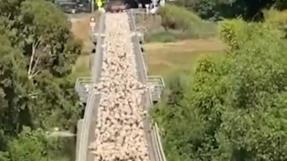 Yeni Zelanda'nın Orta Hawke Körfezi bölgesinde koyunların köprüden geçtiği an kameraya yansıdı.