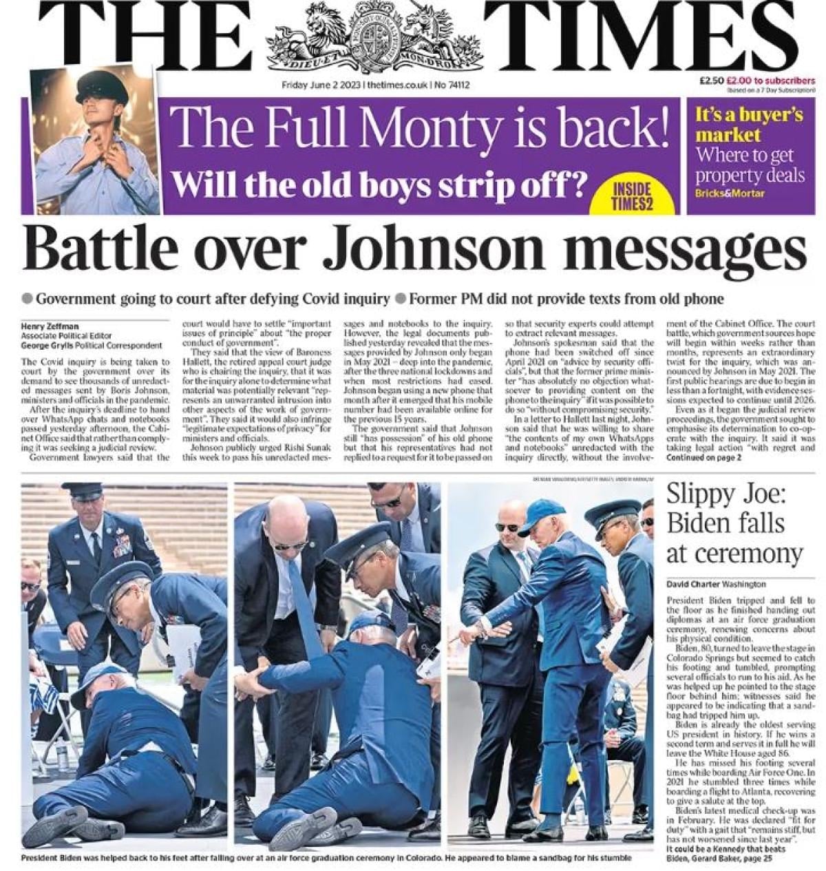 İngiltere'den The Times gazetesi, "Kaygan Joe: Biden törende düştü" başlıklı haberinde, o anlara ilişkin peş peşe üç fotoğrafa yer verdi.