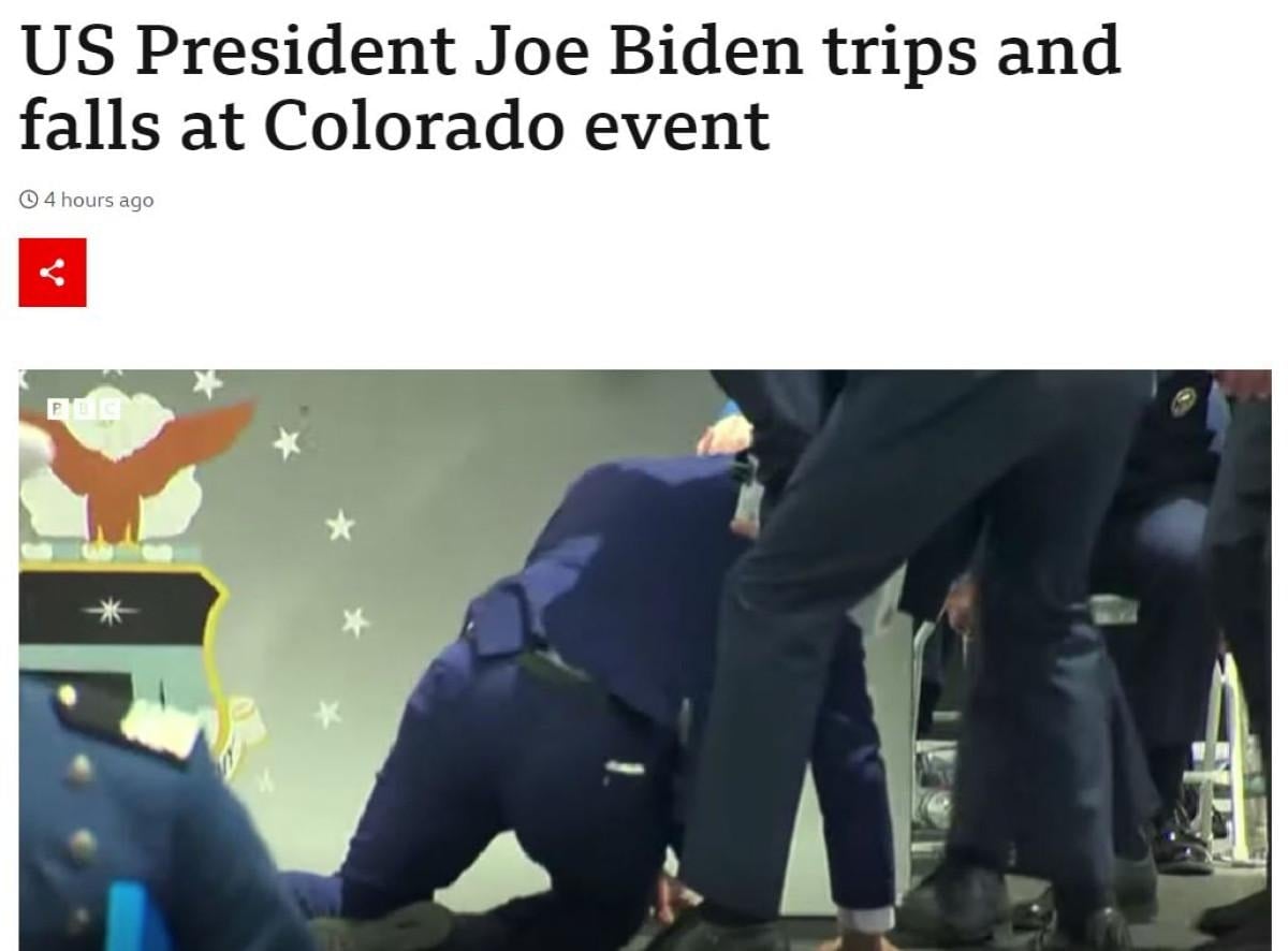 "ABD Başkanı Joe Biden, Colorado etkinliğinde takılıp düştü" diyen BBC, ilgili görüntüleri paylaştı.