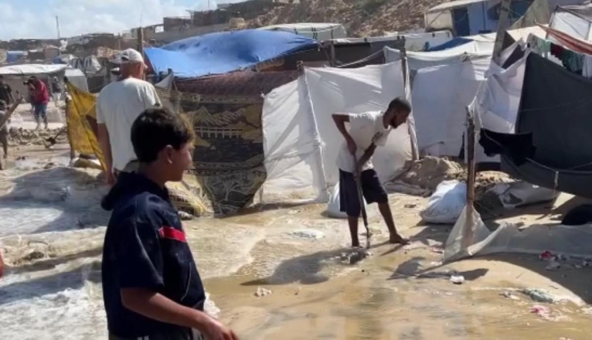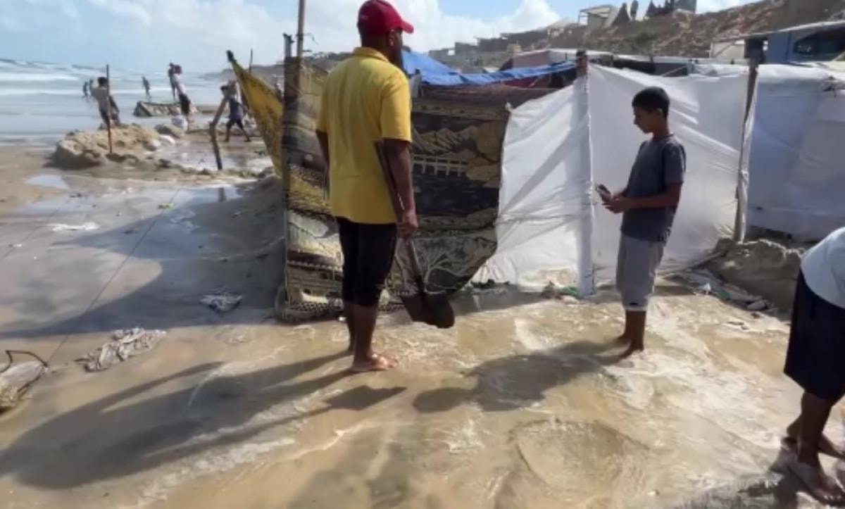 El-Karara Limanı yakınlarında başka barınacak bir yer bulamayan Filistinliler, sabah saatlerinde yükselen dalgaların çadırlarına dolmasıyla uyandı. Yanlarındaki birkaç parça eşya ve yer yatakları, sular altında kaldı. Filistinlilerin zor şartlar altında hayatta kalma mücadelesi sürüyor.