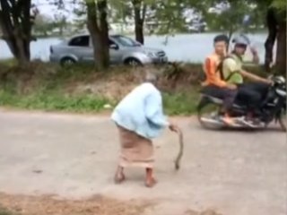 Tayland'da yaşayan yaşlı bir kadın, evinin önünde yakaladığı yılanı elleriyle öldürdü. Yoldan geçenler ise kadını hayretle izledi.